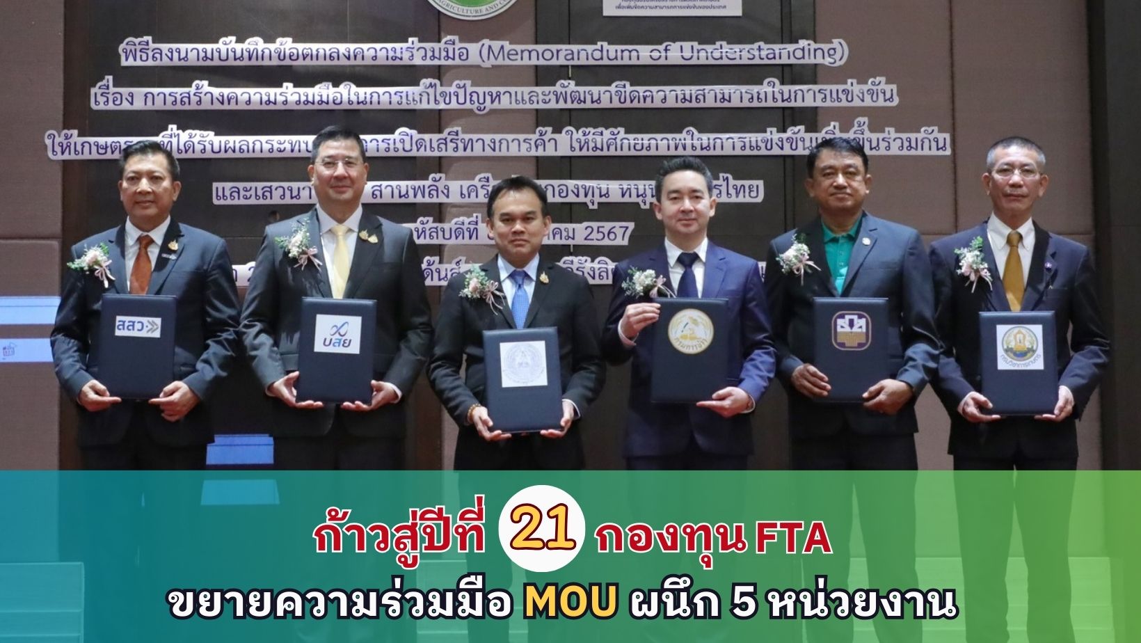 ก้าวสู่ปีที่ 21 กองทุน FTA ขยายความร่วมมือ MOU ผนึก 5 หน่วยงาน ขับเคลื่อนและพัฒนาขีดความสามารถช่วยเกษตรกรที่ได้รับผลกระทบจากการเปิดเสรีทางการค้า......