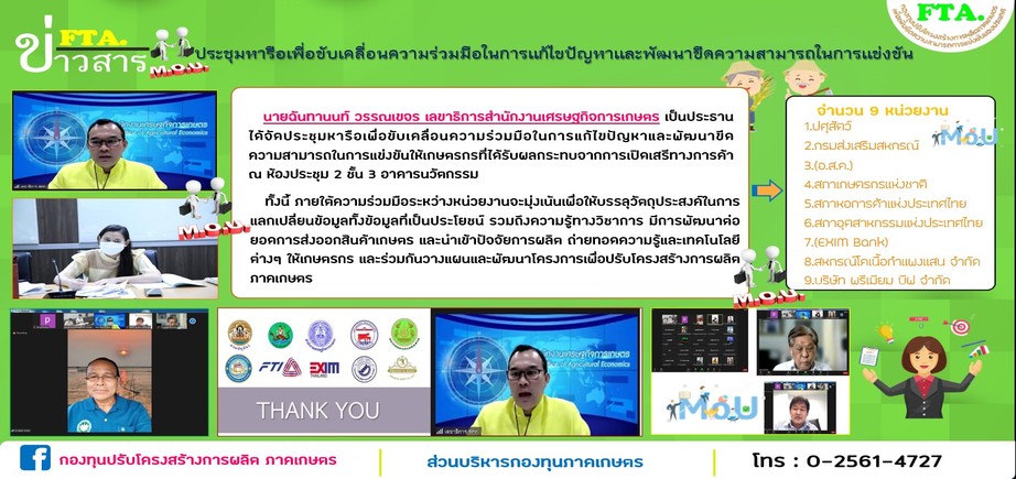 นายฉันทานนท์ วรรณเขจร เลขาธิการ สศก. เป็นประธาน ได้จัดประชุมหารือเพื่อขับเคลื่อนความร่วมมือในการแก้ไขปัญหาและพัฒนาขีดความสามารถในการแข่งขันให้เกษตรกรที่ได้รับผลกระทบจากการเปิดเสรีทางการค้า