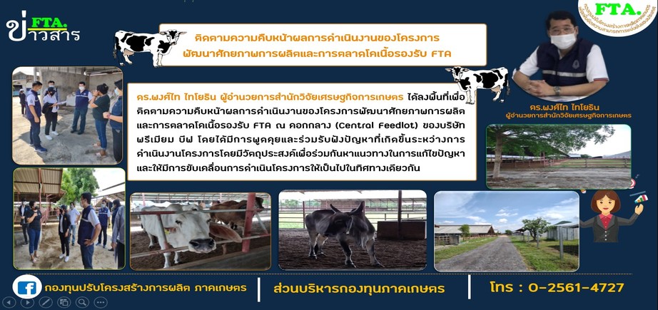 ดร.พงศ์ไท ไทโยธิน ผอ.สำนักวิจัยเศรษฐกิจการเกษตร ได้เดินทางลงพื้นที่เพื่อติดตามความคืบหน้าผลการดำเนินงานของโครงการพัฒนาศักยภาพการผลิตและการตลาดโคเนื้อฯ ณ คอกกลาง (Central Feedlot) ของบริษัท พรีเมียม บีฟ จำกัด