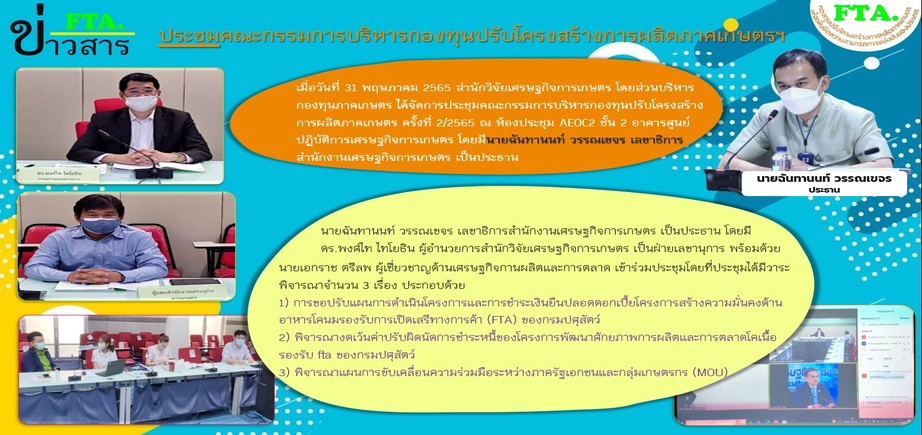 นายฉันทานนท์ วรรณเขจร เลขาธิการสำนักงานเศรษฐ กิจการเกษตรเป็นประธานการประชุมคณะกรรมการบริ หารกองทุนปรับโครงสร้างการผลิตภาคเกษตรฯ ครั้งที่ 5/2565 เพื่อรับทราบผลการดำเนินงานตามตัวชี้วัดฯ และพิจารณาโครงการต้นแบบนำร่องการพัฒนาเกษตร กรผู้ปลูกข้าวสู่การรับรองมาตรฐาน เกษตรอินทรีย์สากล