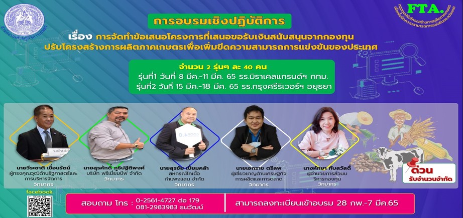 ส่วนบริหารกองทุนภาคเกษตร ได้จัดการฝึกอบรมเชิงปฏิบัติการ หลักสูตร “การจัดทำข้อเสนอโครงการที่เสนอขอรับเงินสนับสนุนจากกองทุนปรับโครงสร้างการผลิตภาคเกษตรฯ” รุ่นที่ 4 ระหว่างวันที่ 25-27 กรกฎาคม 2565